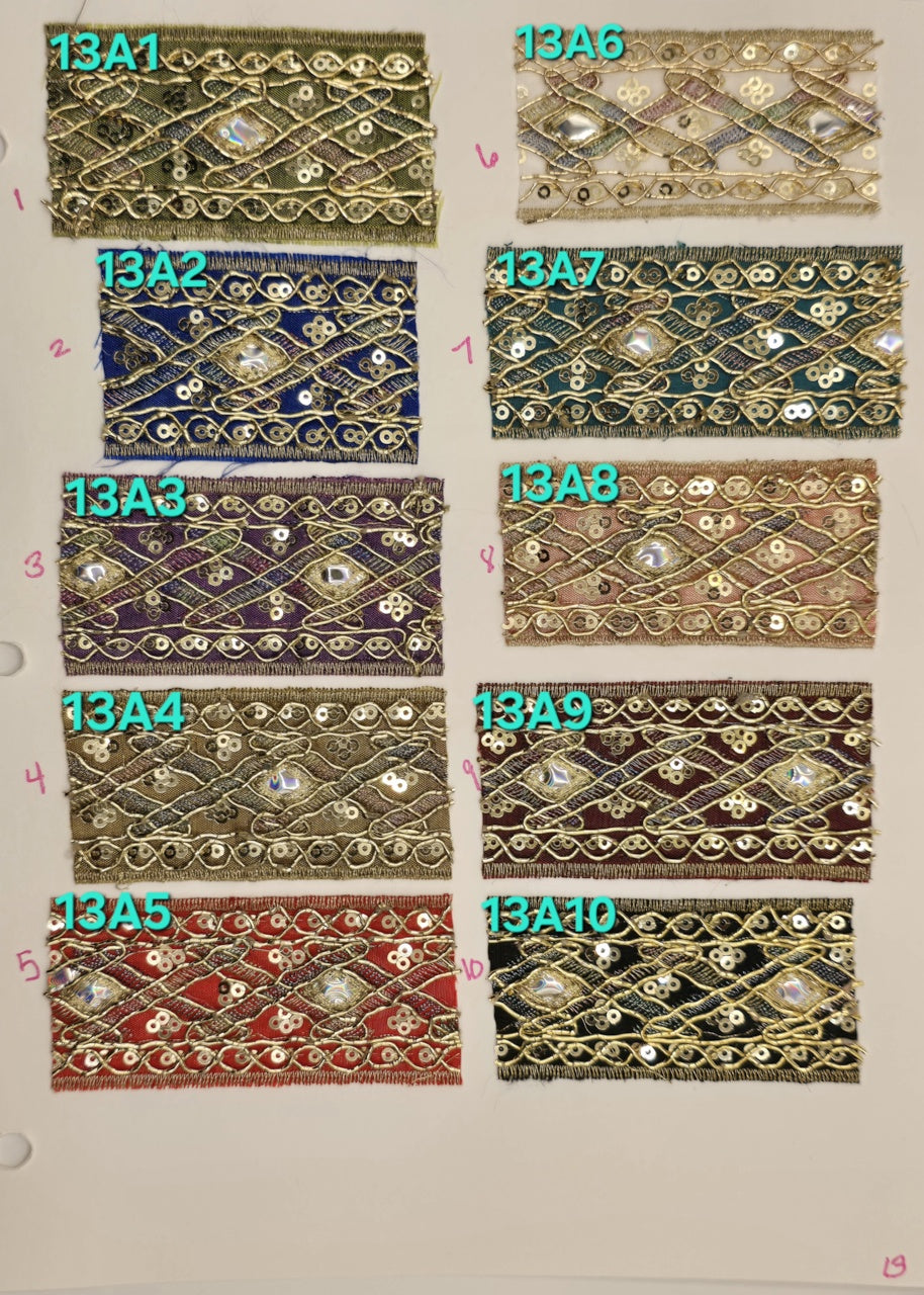 Bracelet A is 1.6 inches wide, a criss-cross geometric pattern embroidered in variegated and metallic gold thread on solid satin. It is available in Moss Green, Royal Blue, Purple, Gold, Red, White, Blue Green, Pink, Deep Red, and Black.